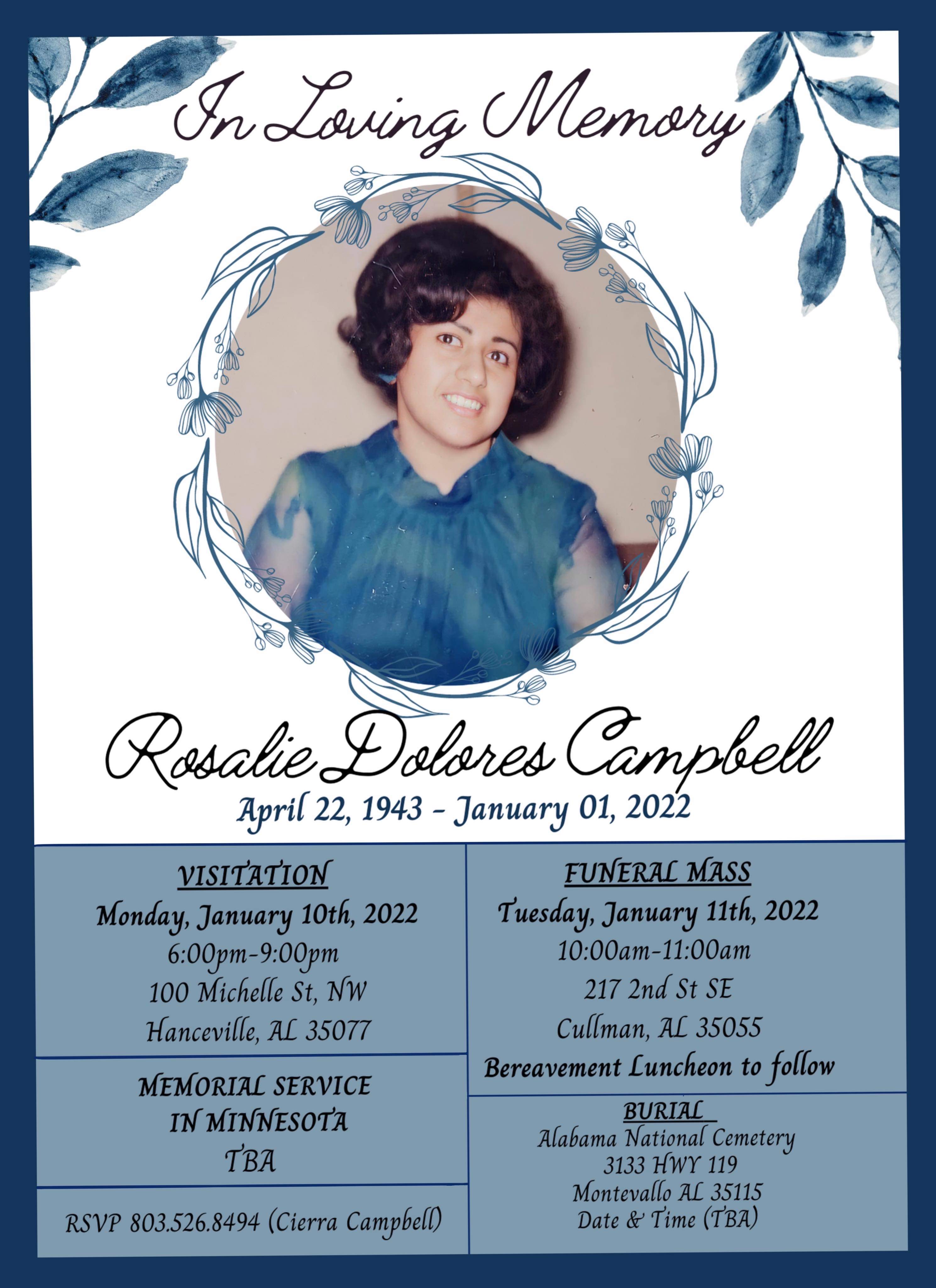 In honor of Edmund Campbell’s desire to be close to his beloved wife Rose Campbell, the funeral mass and burial will be in His new residence in Alabama. You are cordially invited to join us as we celebrate the life of Rose and learn about the special mission that our Lord entrusted to her that spurred an outpouring of blessing on our families. You will be edified and proud of Rose for a “mission accomplished”. Family and Friends, we hope you can attend.